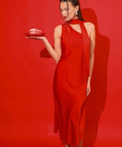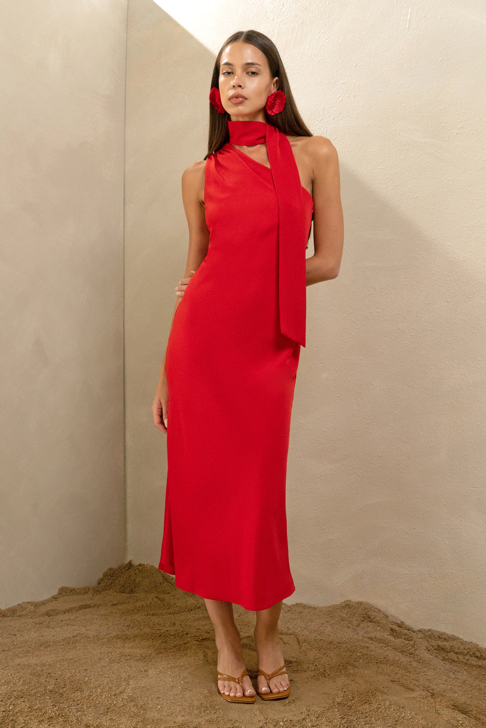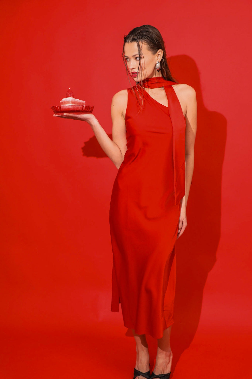 The Saffron Dress is a one shoulder dress that falls to a midi dress. It features an attached scarf which can be worn or tied in various ways.
