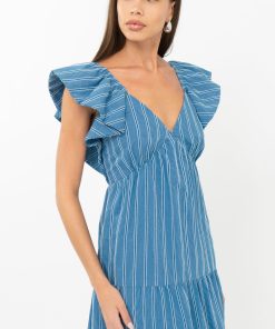 Adelyn Rae Women’s Shannon Striped Flutter Sleeve Tie Back Midi Dress | Blue