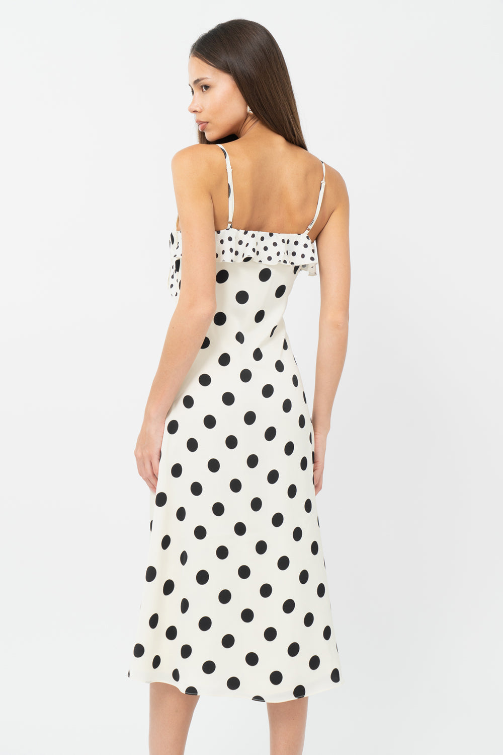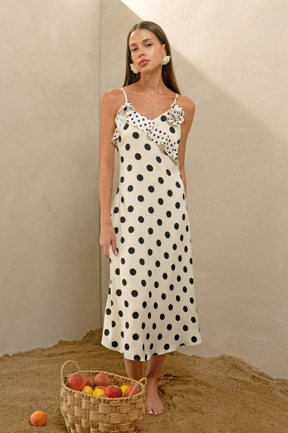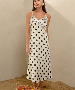 This polka dot slip dress shows off romantic ruffle details along the chest and a rose applique. Installed with adjustable straps.