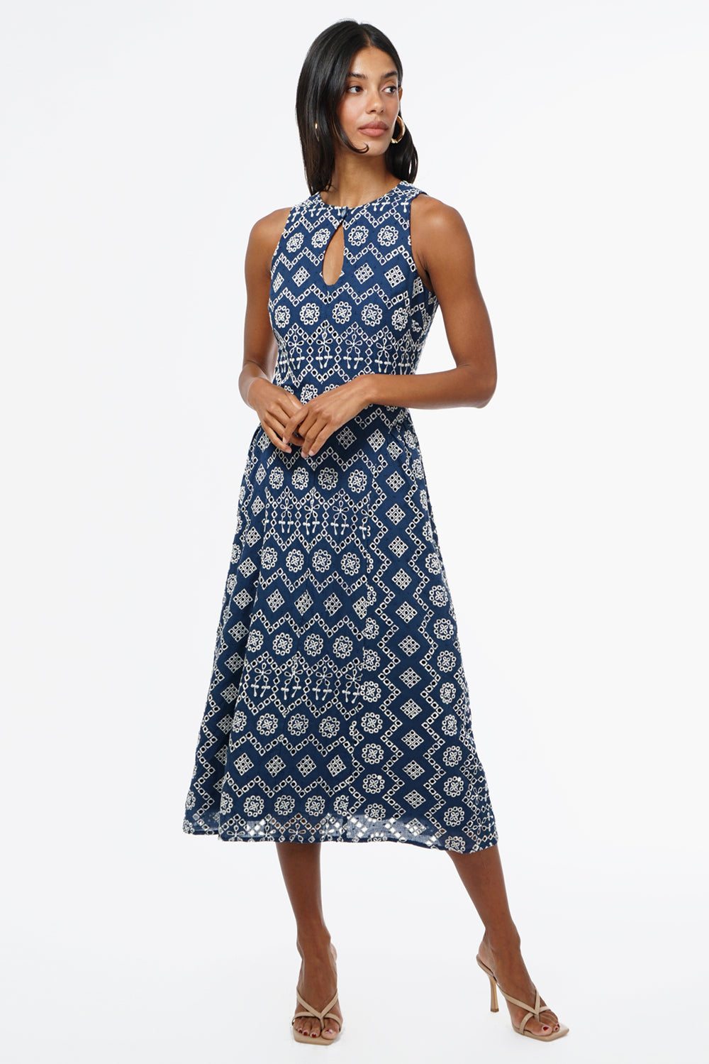The Soraia Dress blends structure with softness in a navy cotton eyelet fabric, sculpting the waist and skimming the body with just the right amount of movement. The high neckline with a keyhole cutout adds a touch of drama, while the A-line silhouette keeps it wearable and refined.