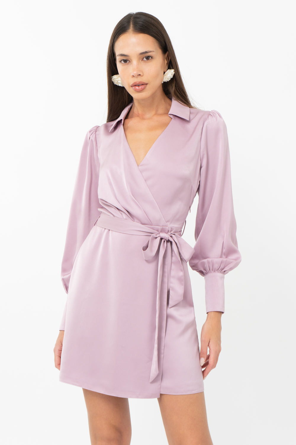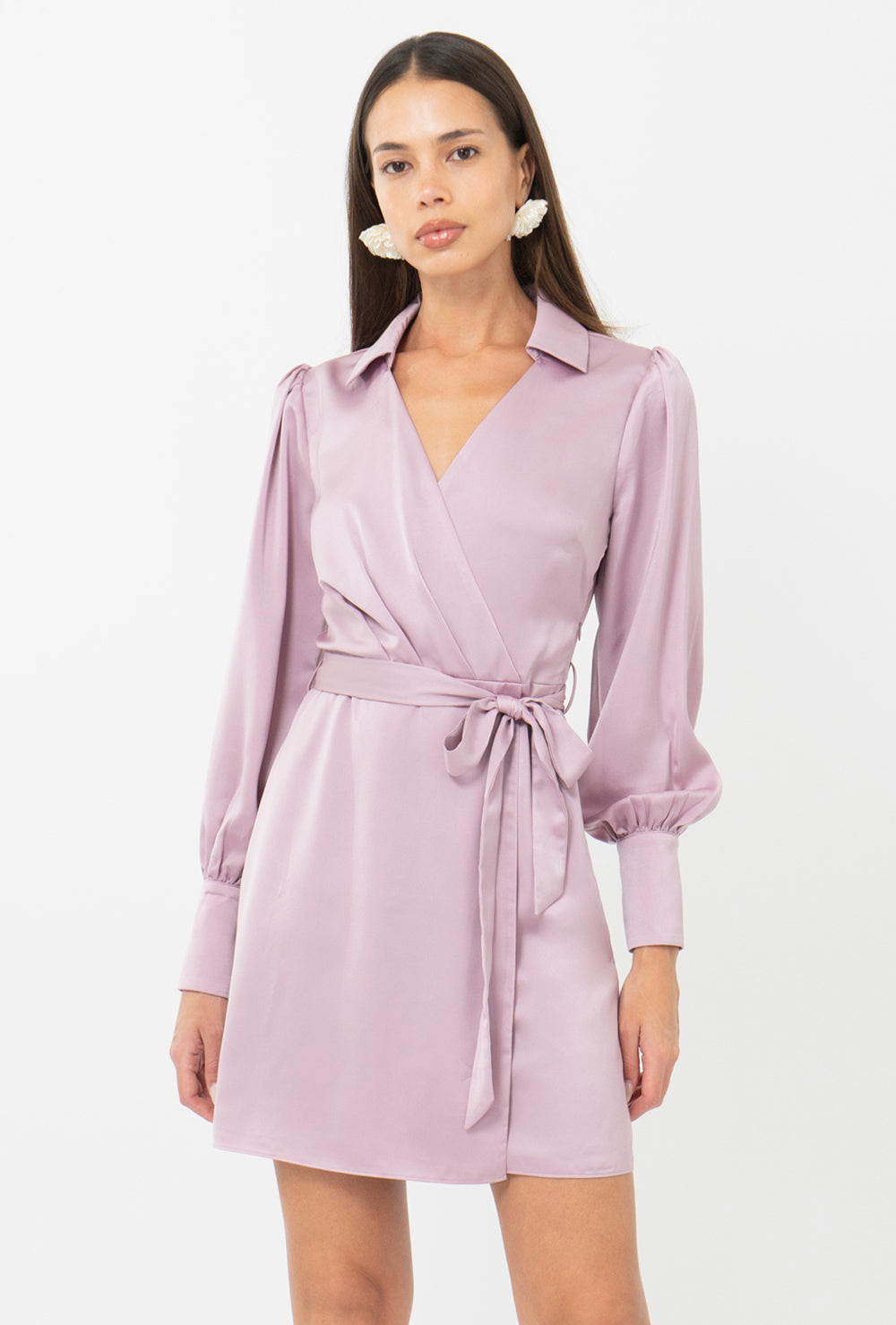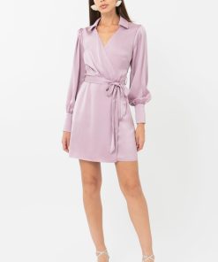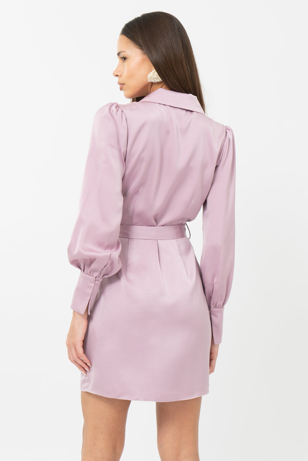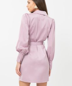 From desk to drinks, “Thea” is the perfect transitional dress for a variety of occasions. The shirt dress silhouette is adorned with a tie waist belt and an open collar. Made of satin, the dress has a loose and lightweight feel when worn.
