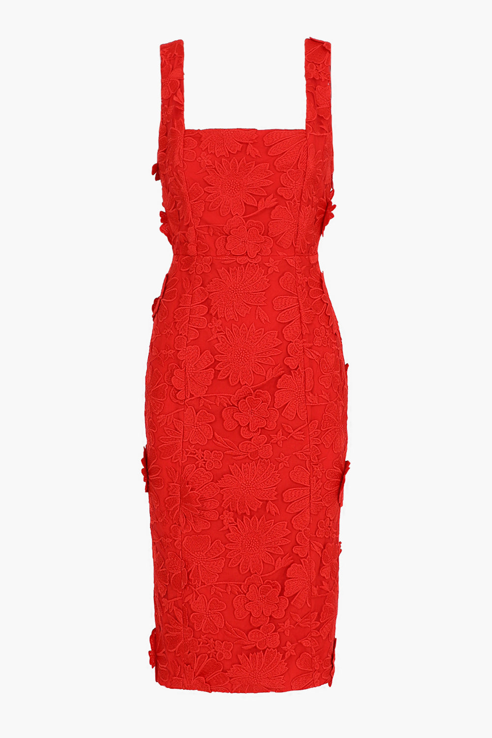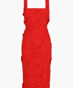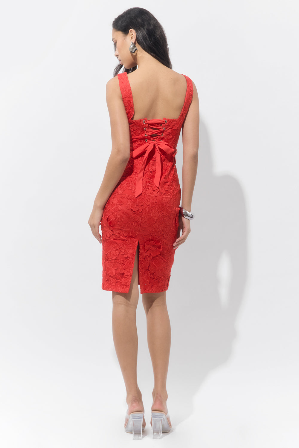 Sleek, sculpted, and undeniably feminine—the Vonna Midi Dress is a modern take on romantic dressing. Crafted in bold red with intricate 3D floral embroidery, this body-contouring silhouette features a square neckline, wide straps, and a flattering midi length. Side lace-up details add a subtle edge, balancing softness with structure.