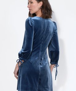 This stunning mini dress, in a delicate icy blue hue, is crafted from a luxurious, soft velvet fabric that drapes beautifully. The design features a chic halter-style neckline that creates an elegant silhouette.